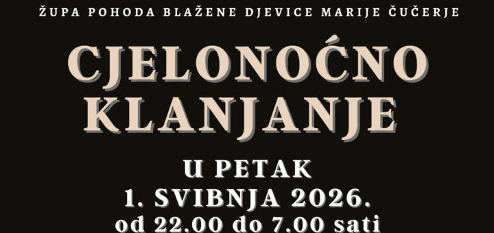 CJELONOĆNO KLANJANJE – Na Prvi petak od 22 h do 7 h, kada će biti blagoslov s Presvetim! Posebno pozivamo bračne parove, muževe i očeve iz naše župe da se odazovu na klanjanje u...
