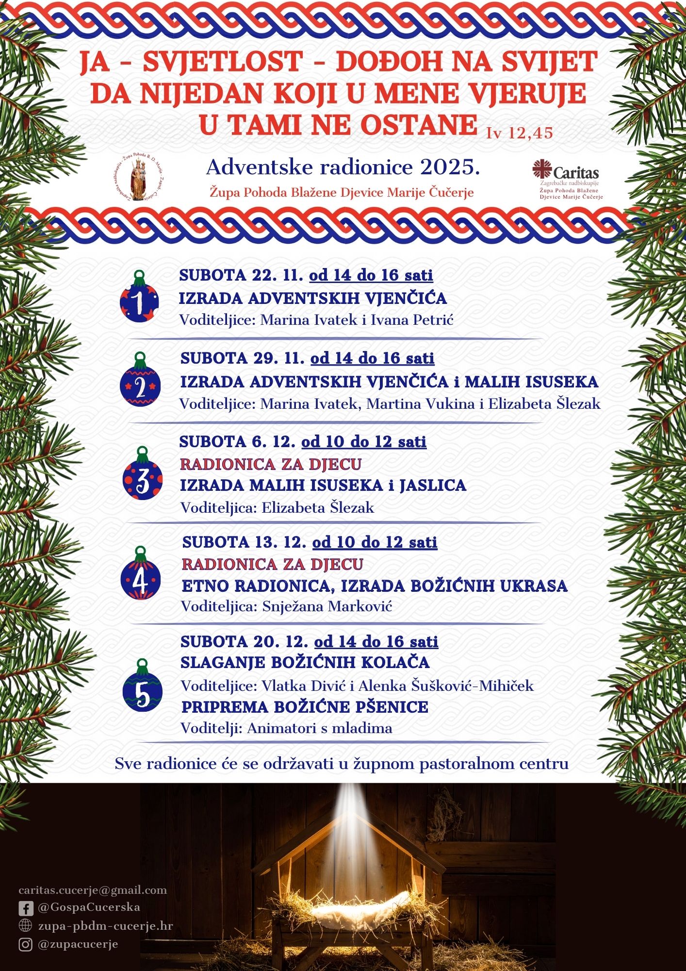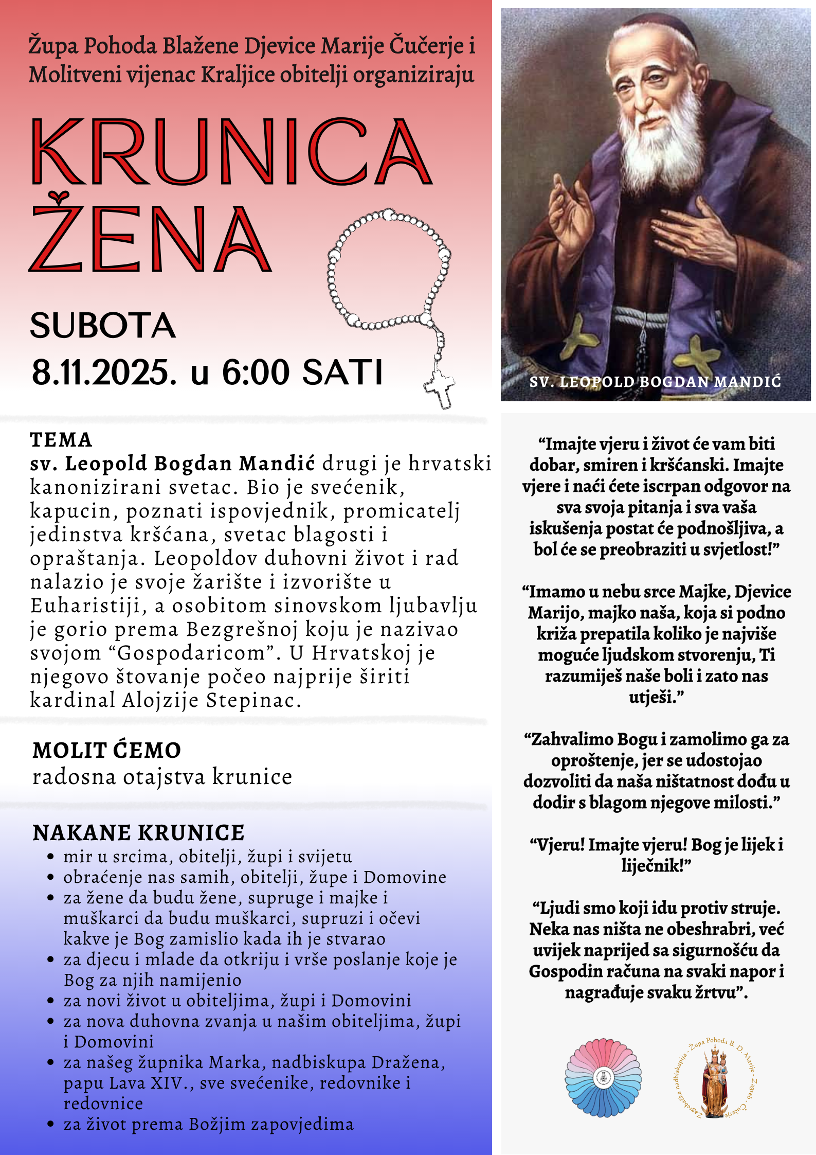 Misne nakane – CRKVA U ČUČERJU Ponedjeljak, 24.11.2025. – Sv. Andrija Dung-Lac i mučenici 15.40 h + Ruža Strancarić, sprovodna misa Utorak, 25.11.2025. – Sv. Katarina Aleksandrijska 15.40 h + Franjo Rustan, sprovodna misa...