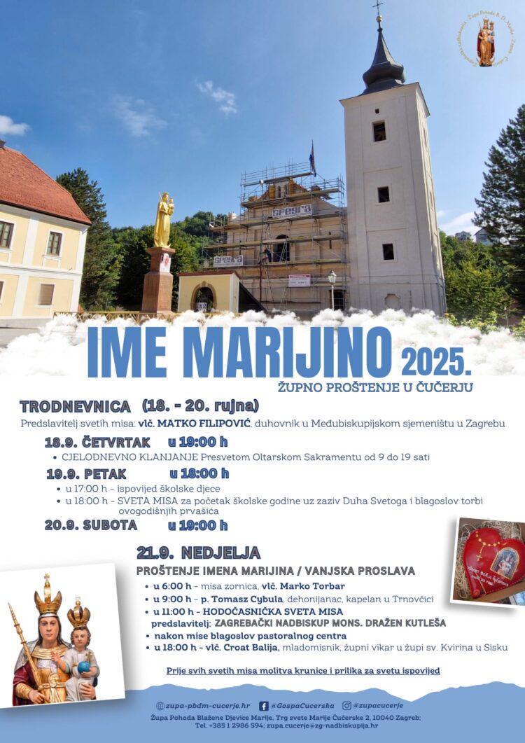 Sveci u tjednu Misne nakane – CRKVA U ČUČERJU Ponedjeljak, 29.9.2025. – Sv. Mihael, Gabrijel i Rafael, arkanđeli 17.30 h – molitva krunice 18.00 h + Miško Krvarić i ob. Tomo i Vera Marković Utorak, 30.9.2025. – Sv. Jeronim, crkveni naučitelj 18.30 h – molitva krunice 19.00 h + Sonja Gašparec i ob. + Barbara […]