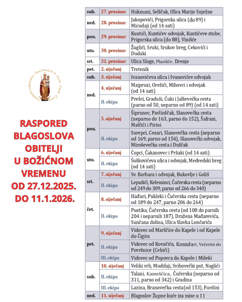RASPORED BLAGOSLOVA OBITELJI U BOŽIĆNOM VREMENU OD 27.12.2025. DO 11.1.2026.