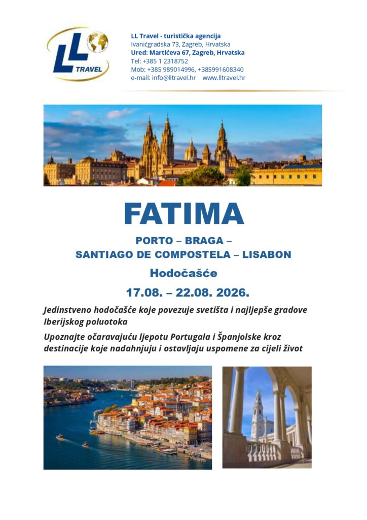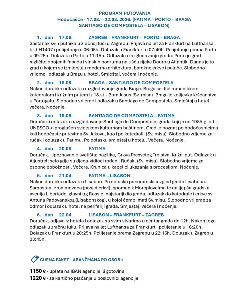 Najavljujemo hodočašće avionom u Fatimu u godini slavlja 825. godišnjice mjesta i župe, Santiago de Compostelu, Bragu, Porto i Lisabon, koje će se održati od 17. do 22. kolovoza 2026. godine.