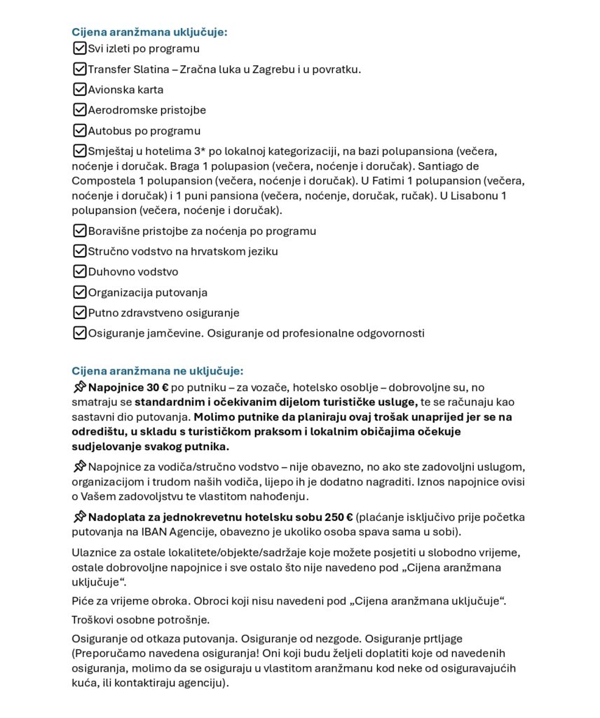Program: uključuje posjet svetištu Gospe Fatimske, svetištu sv. Jakova u Santiagu de Composteli te razgled ostalih navedenih gradova.
